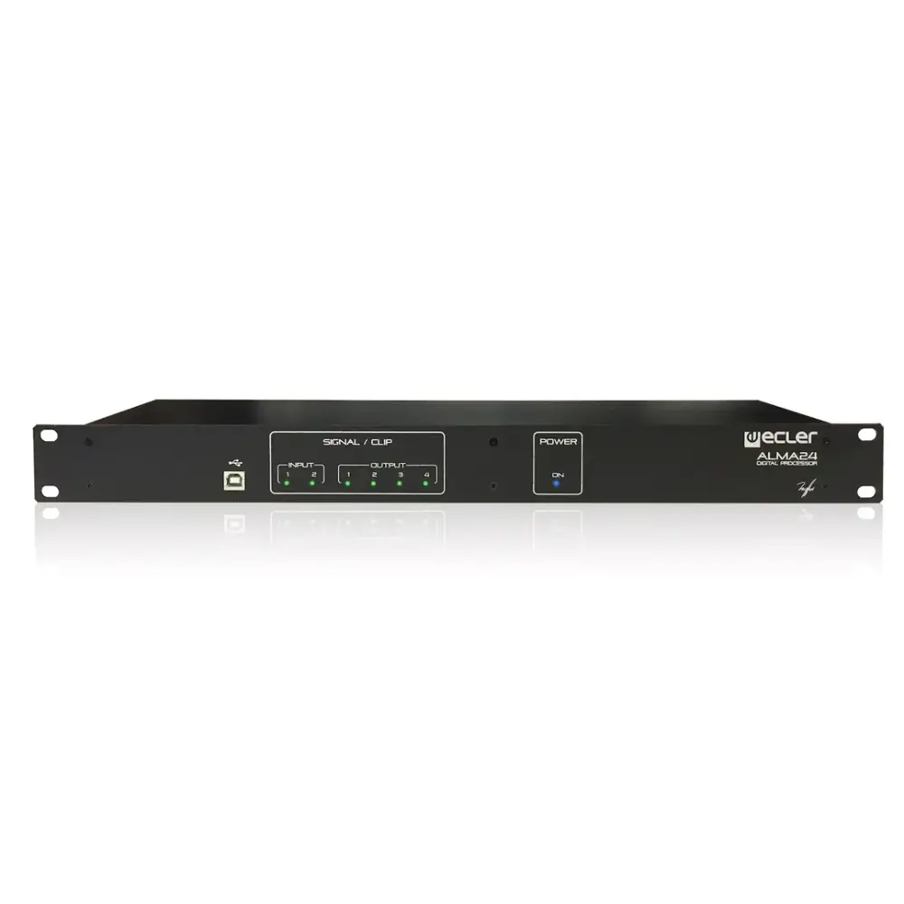 ALMA24 is a digital loudspeaker manager including 2 audio inputs and 4 audio outputs, USB interface and 2 volume remote control ports (0-10VDC). ALMA24 is a 1RU stand-alone processor.