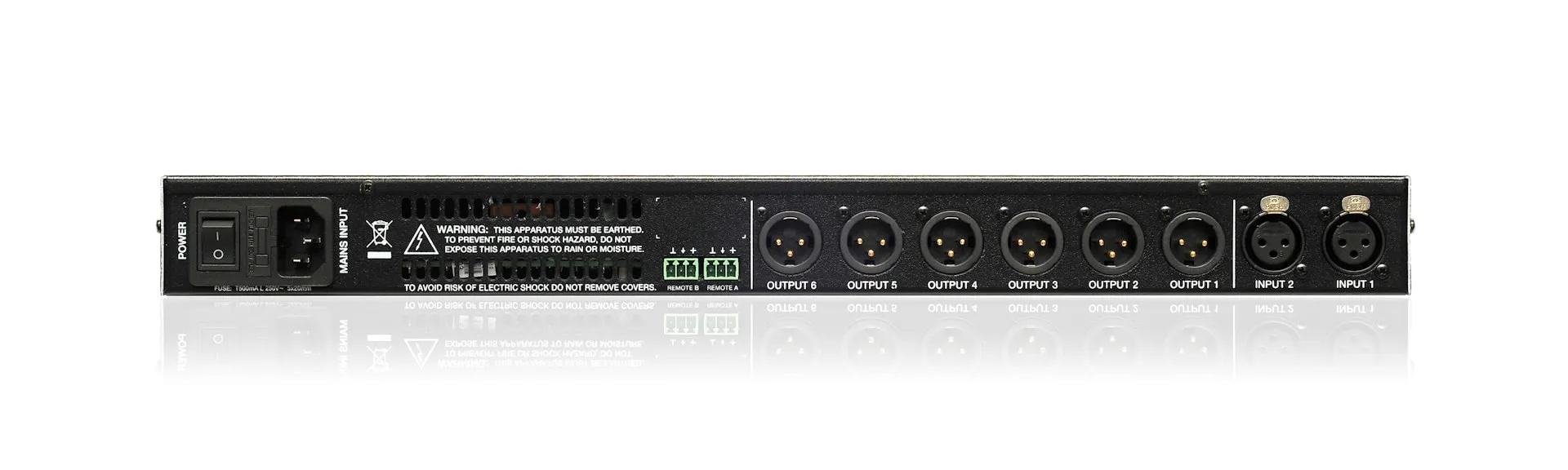 ALMA26 is a digital loudspeaker manager including 2 audio inputs and 6 audio outputs, USB interface and 2 volume remote control ports (0-10VDC).