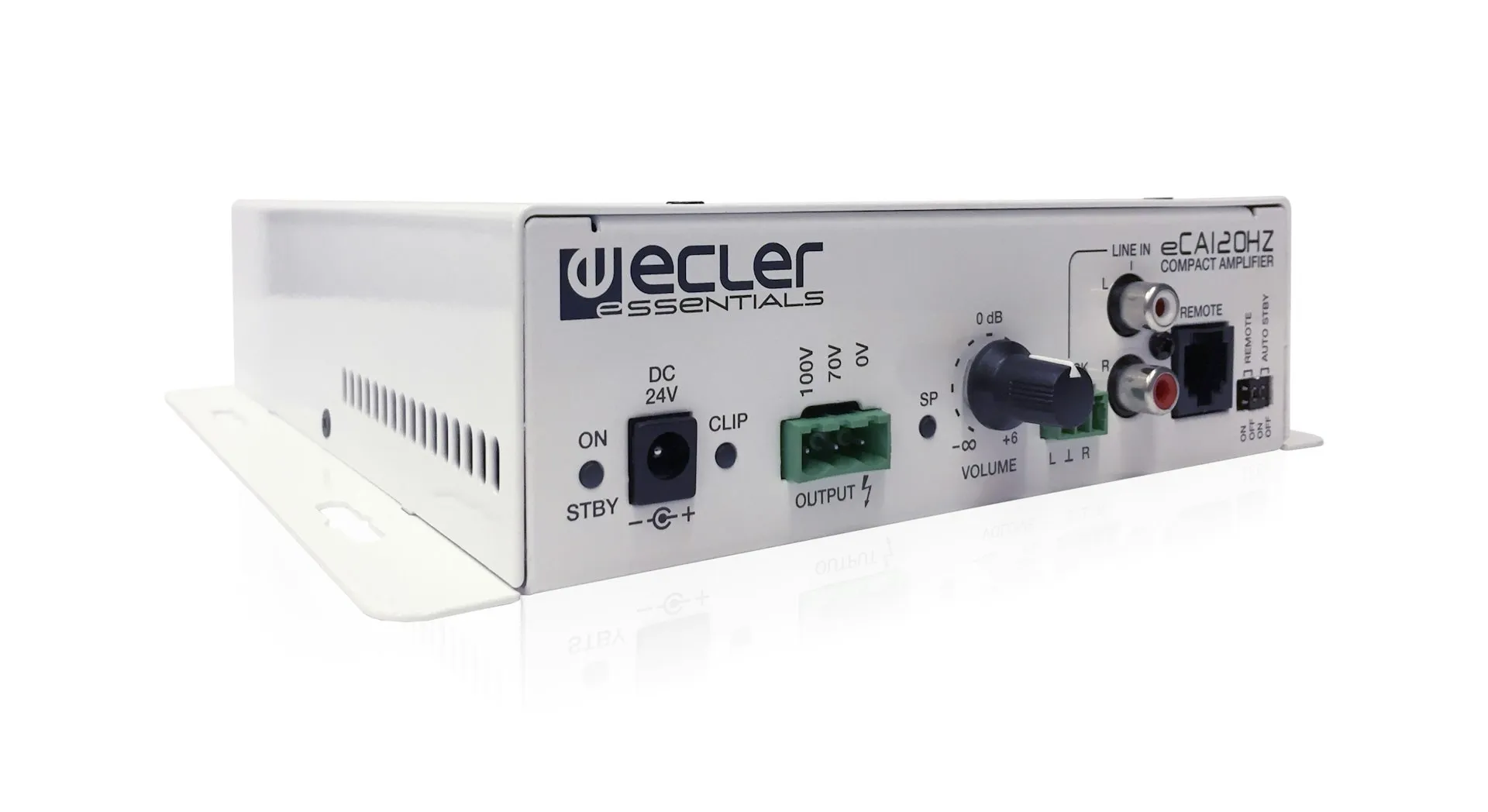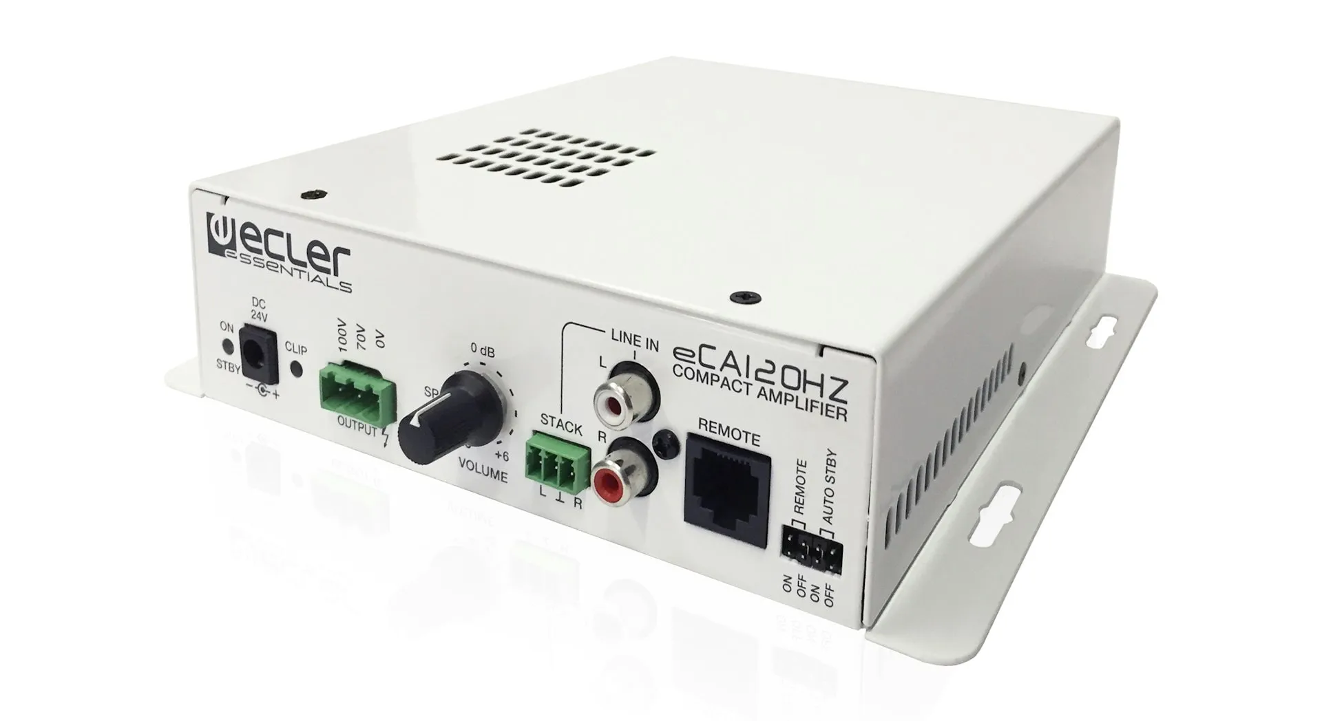 eCA120HZ is a mono micro-amplifier delivering 1 x 106W RMS @ 70V / 100 V line level (high impedance), built in a very compact format and a light and silent (fanless) design. It features 1 LINE stereo input, AUTO STANDBY function and volume remote control, compatible with ECLER WPaVOL and WPaVOL-SR wall panels (0-10 VDC). External, universal and CE/UL/CCC certified power supply.