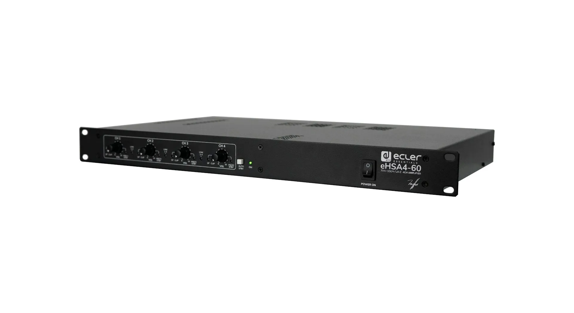 eHSA4-60 is a 4x60W multichannel amplifier capable of working on both low impedance lines (8 / 4Ω) and high impedance lines (70/100V). It can link the input channels, so that the same input signal can be easily distributed to several or all output channels. Independent auto stand-by function per channel. Ecler eHSA line of amplifiers offers the renowned professional reliability of Ecler amplifiers at an affordable price. All models in the series use class D amplification – a very high-performance technology -, auto stand-by function and convection ventilation, only occupying 1 rack unit high. Equipped with balanced inputs on Euroblock connectors. Outputs also feature Euroblock connectors. It has an electronic limitation system to avoid signal saturation and a thermal protection, as well as a protection system against overload.