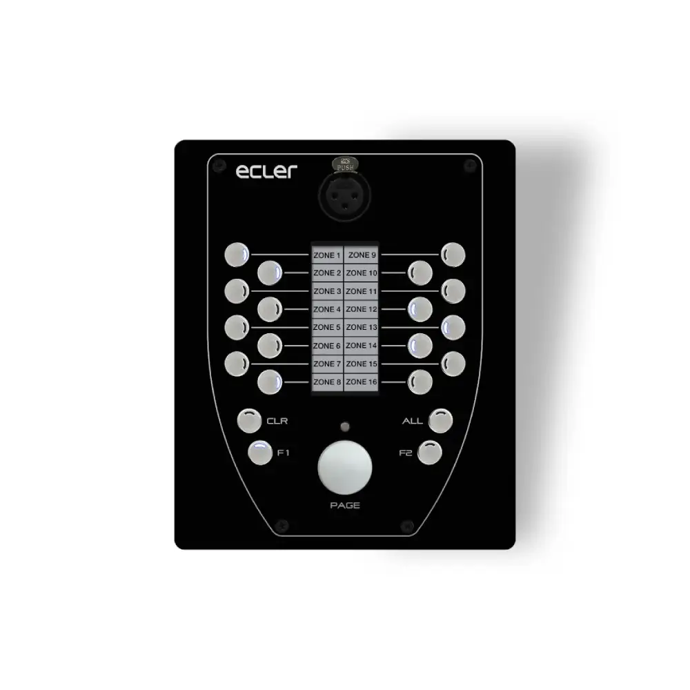 eMPAGE is a digital paging station (MPAGE16’s evolution), compatible with HUB, MIMO88, MIMO88SG and MIMO1212SG digital matrixes. Includes: a gooseneck cardioid microphone (removable); 16 zone-selection keys; ALL, CLEAR and PAGE keys; 2 programmable keys, F1 & F2, for zone-group selection. Text labelling for destination areas by means of programmable electronic ink display.