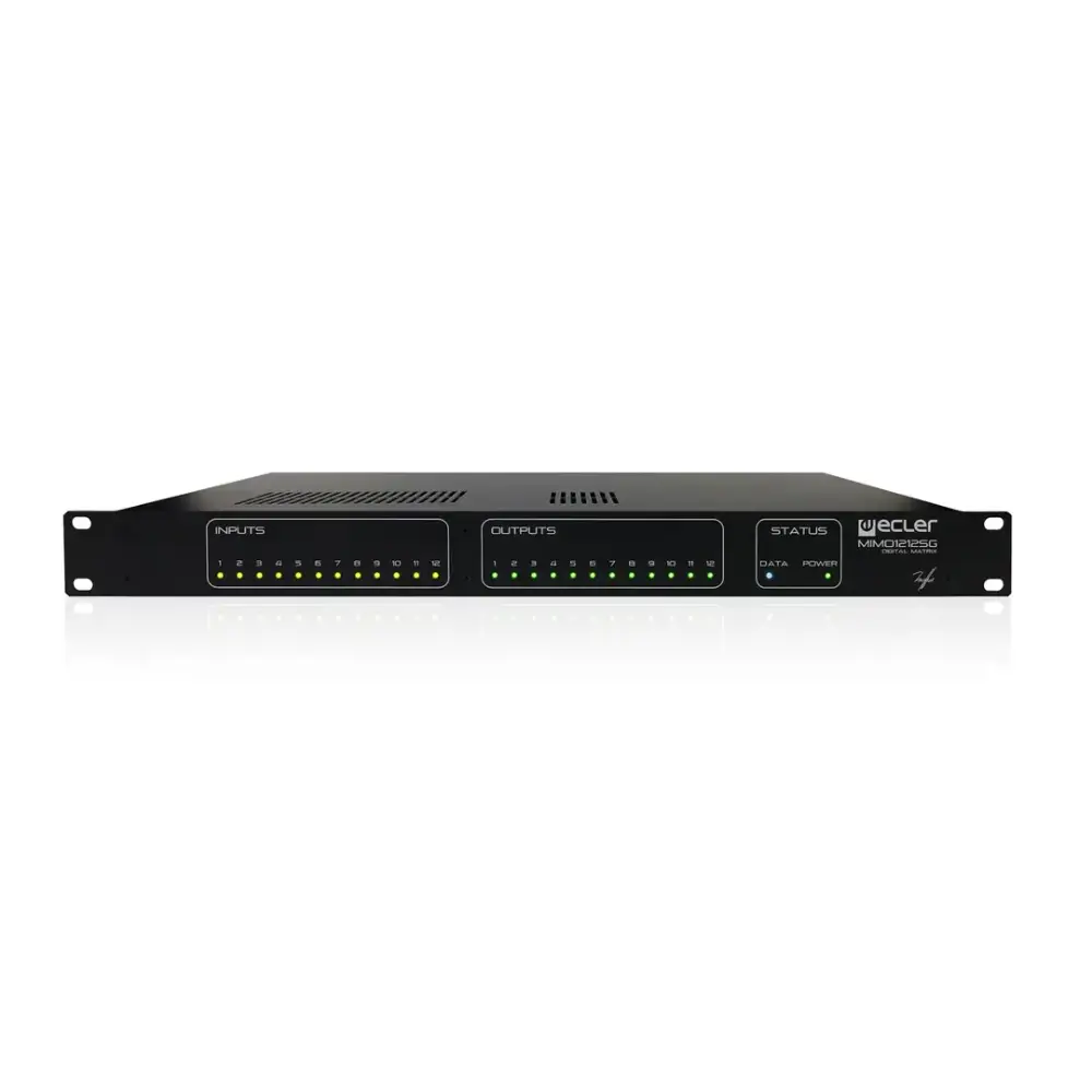 MIMO1212SG (MIMO1212 SINGLE) is an EclerNet digital audio device that keeps the heart and soul of the standard MIMO88, its main features and its audio quality, to become a simplified and cost-effective version (12×12) of this acclaimed digital matrix.