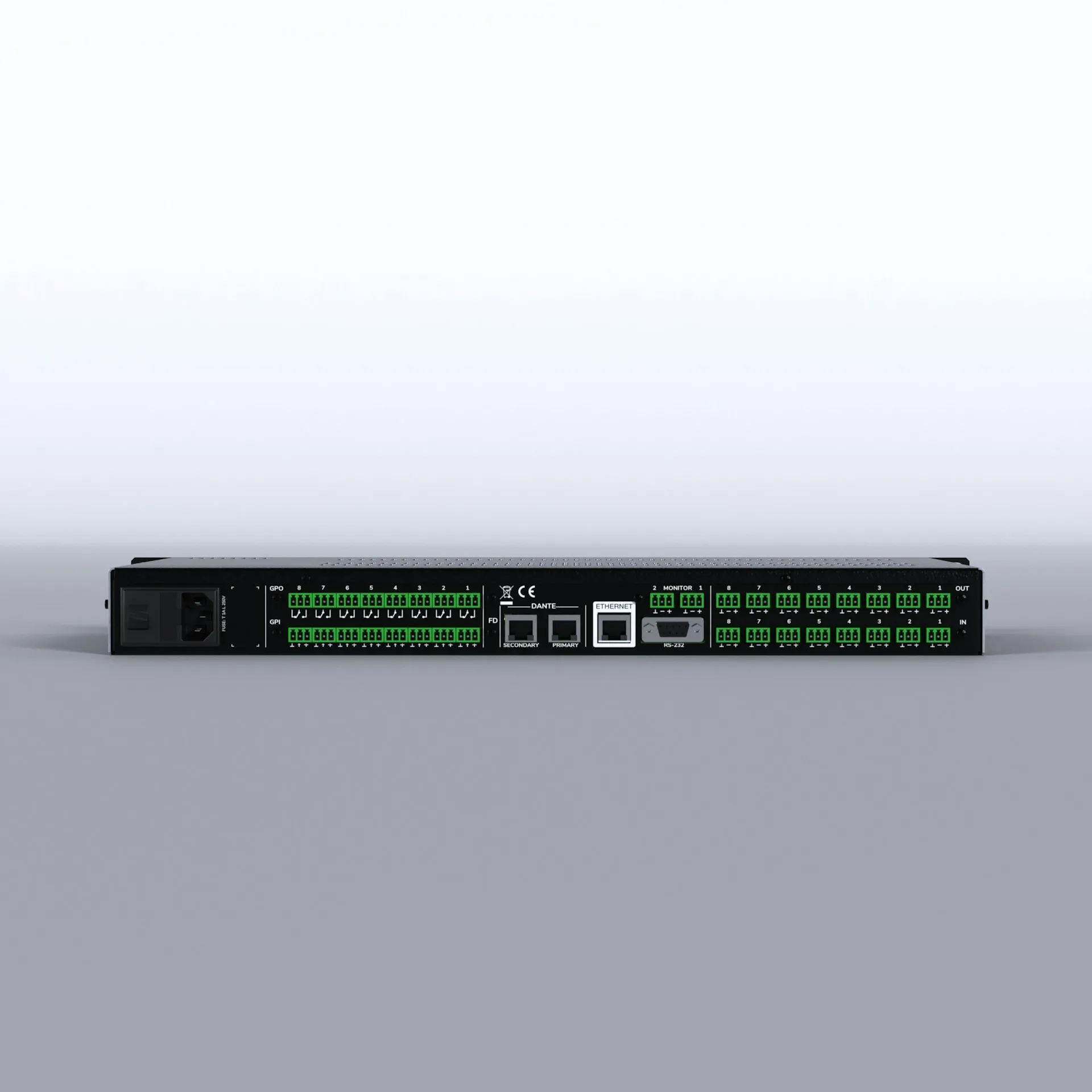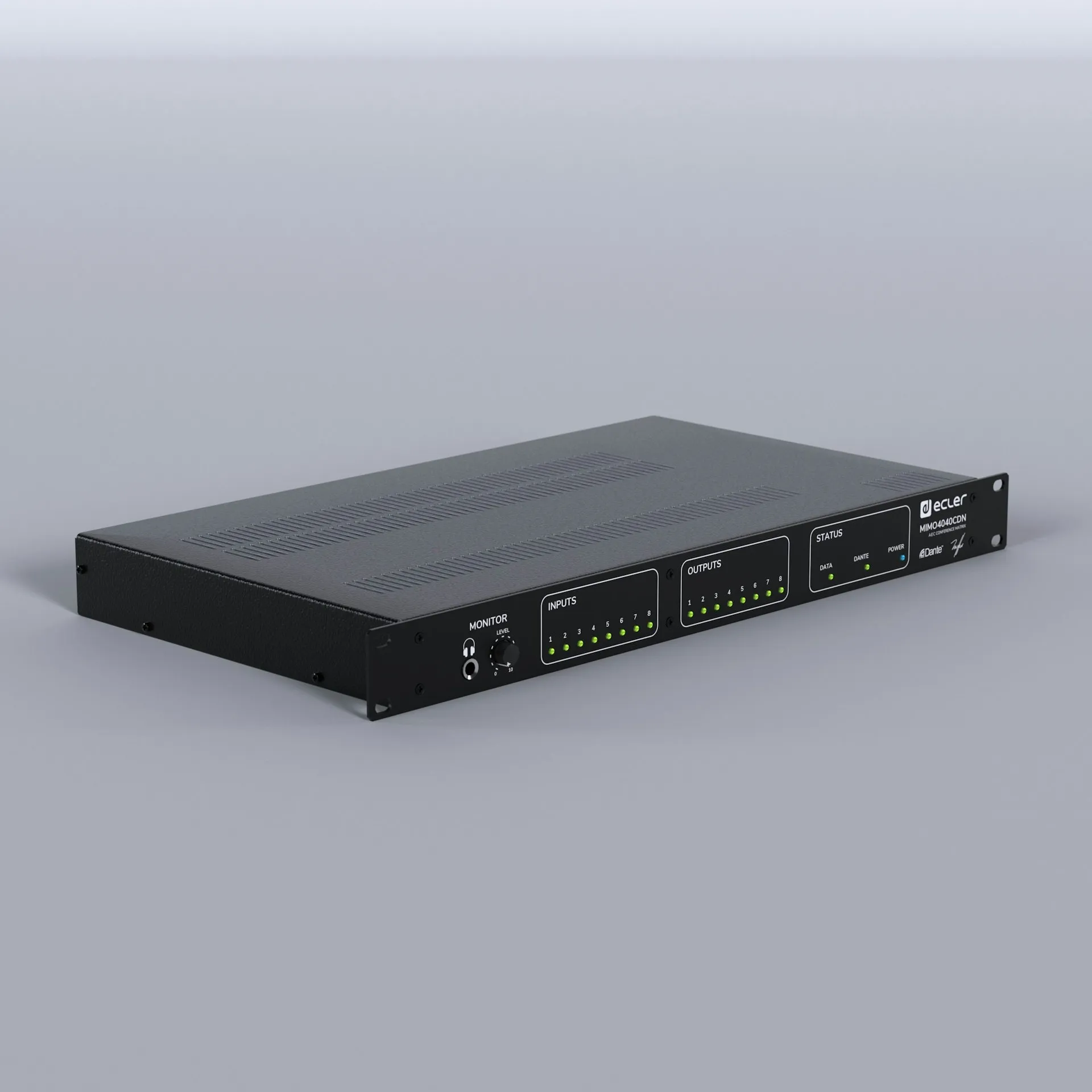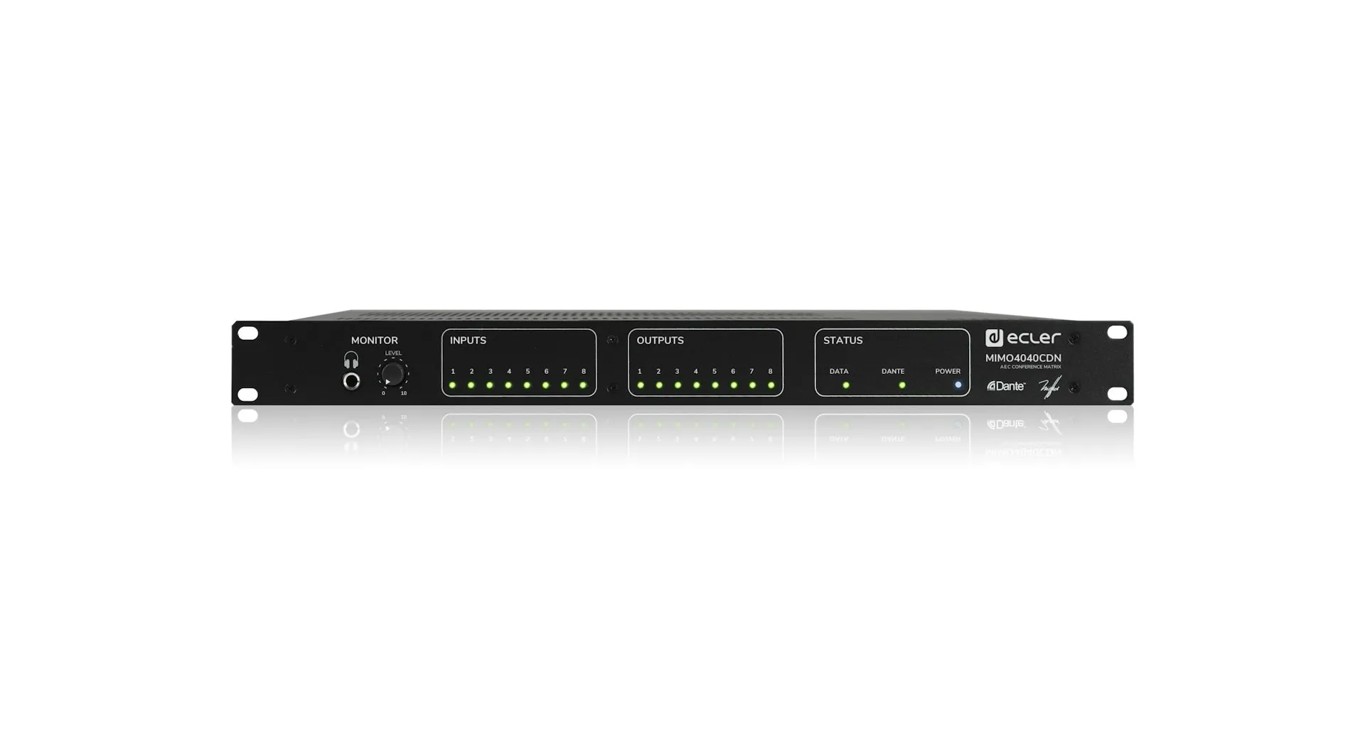 MIMO4040CDN is is a digital audio matrix including a native (full DSP) matrix of 40×40 input and output audio channels total size, specially designed for conference rooms. It includes functions such as AUTOMIXER or FEEDBACK KILLER by default, as well as up to 8 microphone channels with AEC (Acoustic Echo Canceling) processing activated by software licenses.