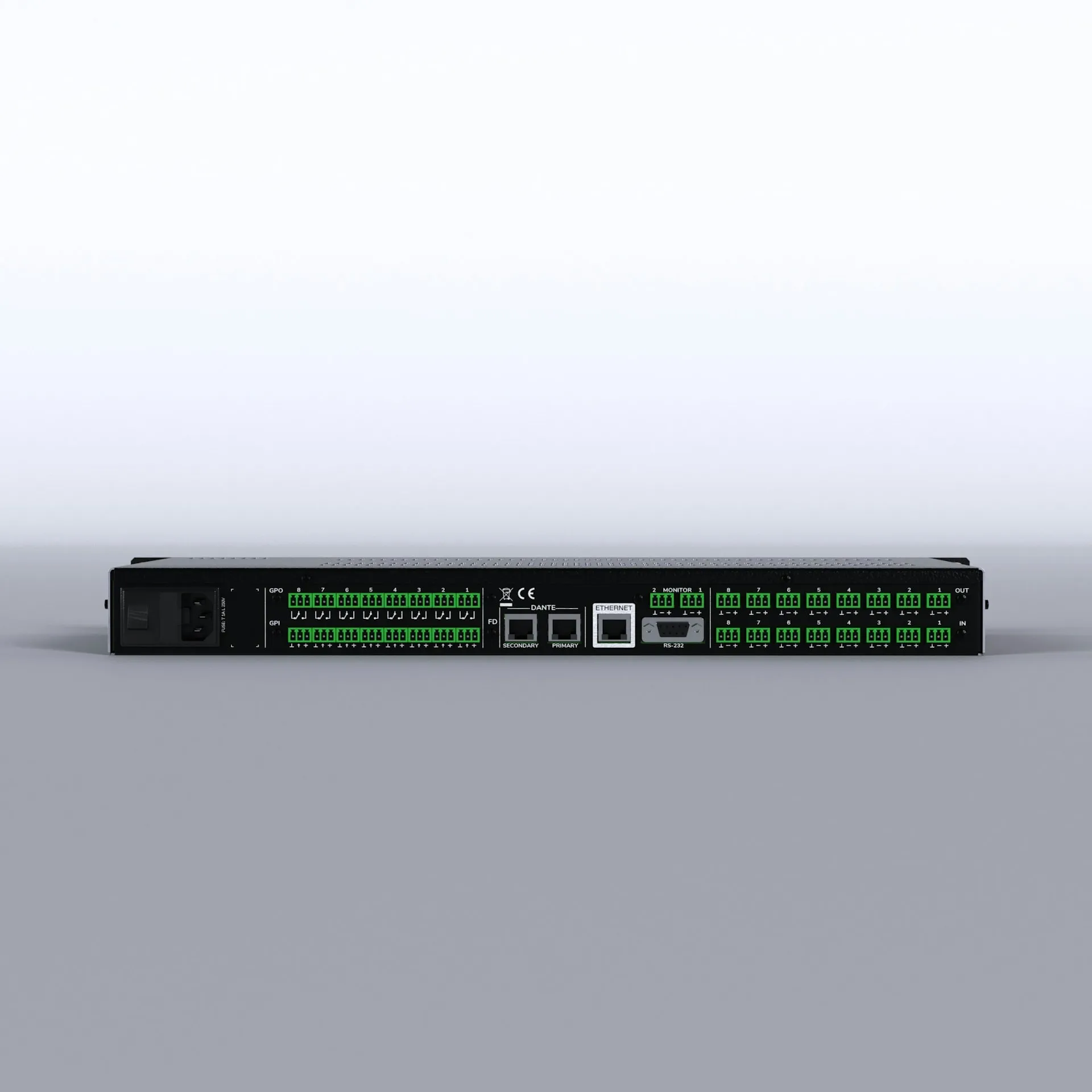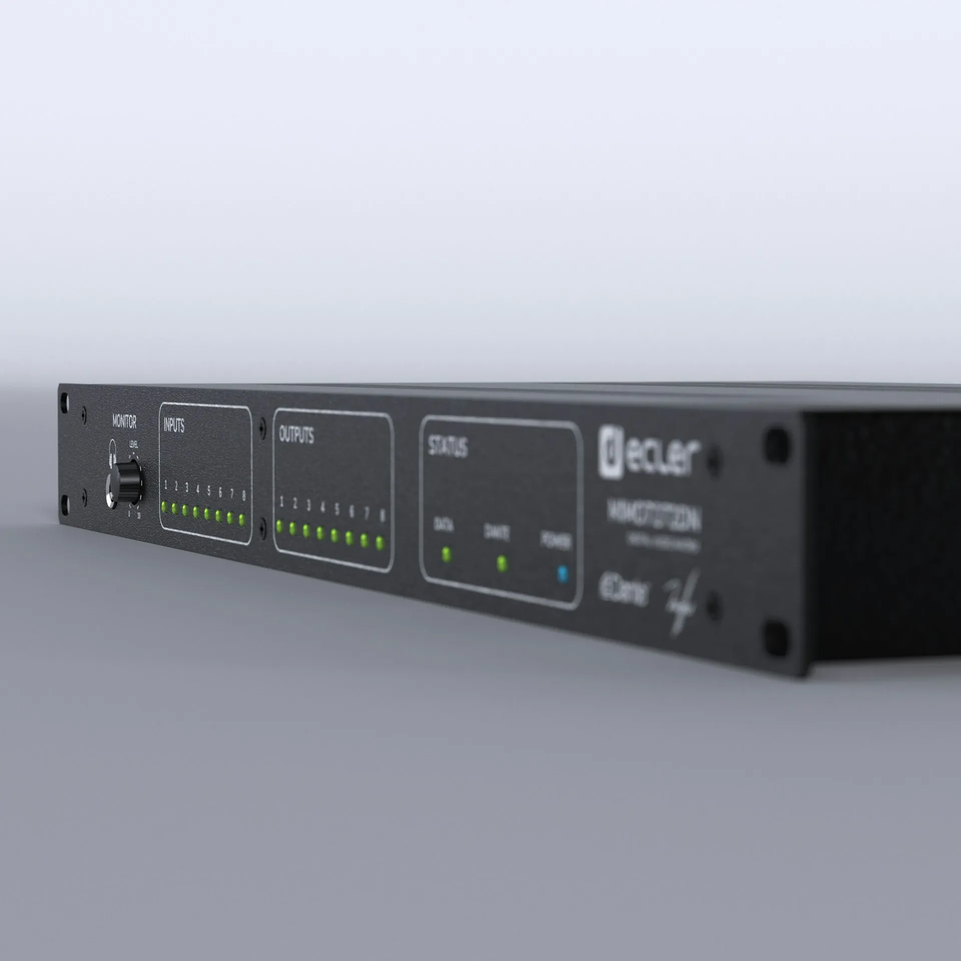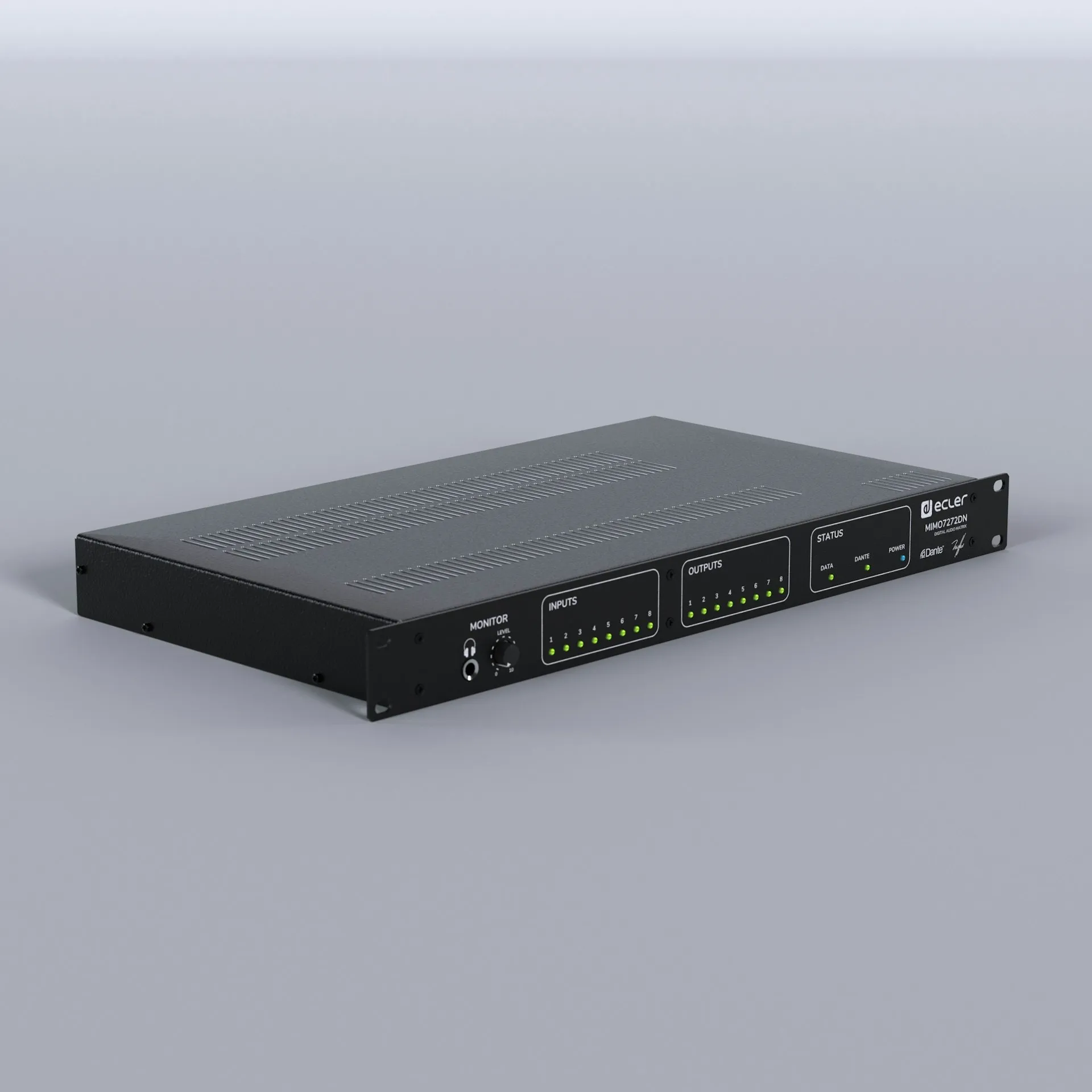MIMO7272DN is a digital matrix including 72 audio inputs and 72 audio outputs (8 analogue inputs, 8 analogue outputs, 64 Dante™/AES67 digital inputs and 64 Dante™/AES67 digital outputs), and a native internal matrix of 64×64 simultaneous input / output channels. Incorporating audio over IP technology, MIMO7272DN allows signal transmission using a Local Ethernet network, suppressing cabling distance limitations. It features accessories from WPNET Series connected by Ethernet interface and PoE DC supply ready. This ensures flexible and efficient installations. MIMO7272DN is also capable of executing EclerNet projects embedded into its processor and electronics engine, acting as a UCP (User Control Panels) server within an EclerNet devices network.