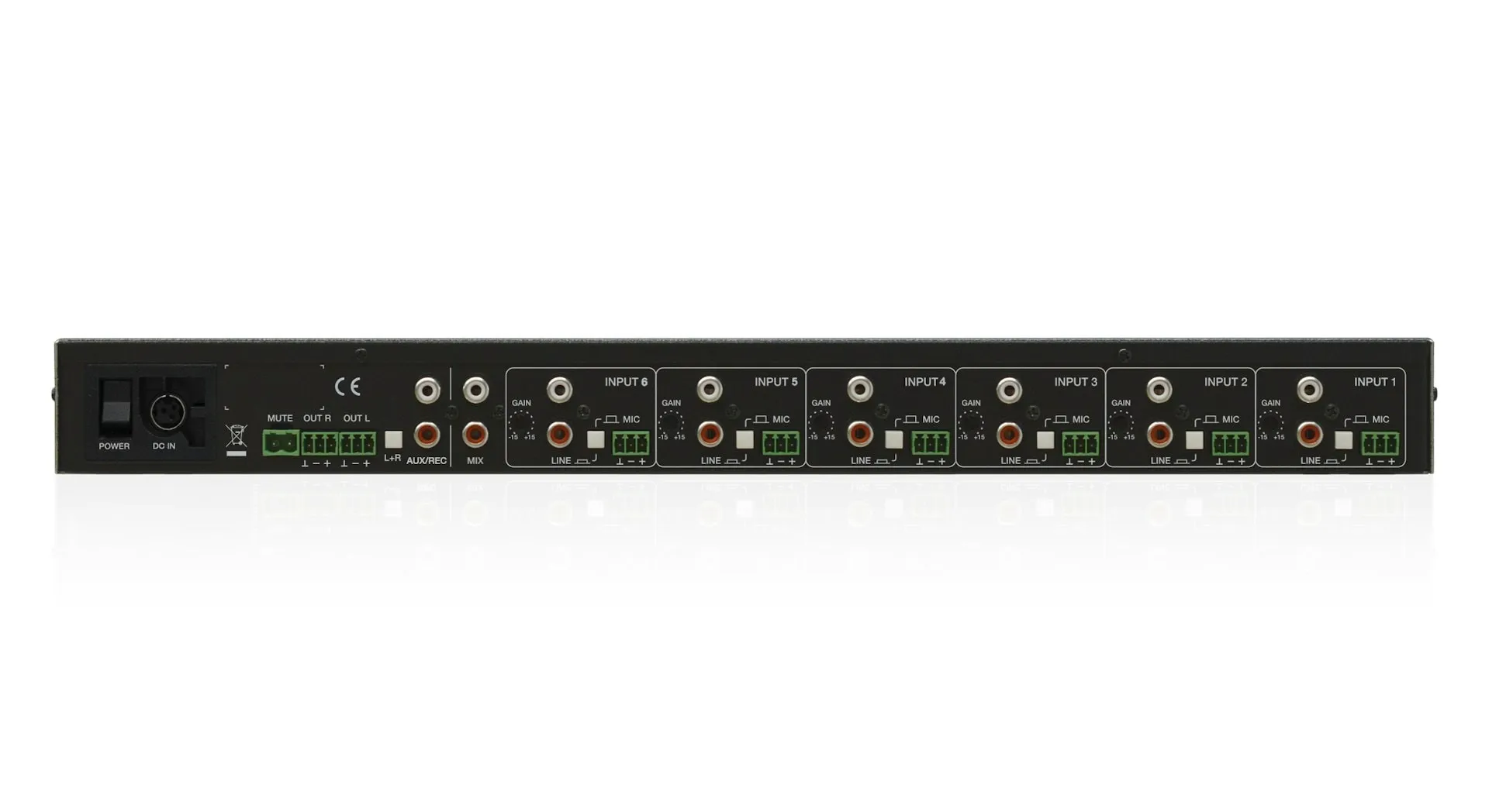 SAM612T is an installation audio mixer in standard rack format, featuring 6 MIC/LINE ST inputs + 1 ST MIX input and 1 ST MAIN output + 1 ST REC output. Each input has a dedicated 3-band tone control, a feature which is fundamental to get a perfect microphone mix in an installation. Input 1 includes talkover (priority) function over the mix bus and additional front panel jack connector. Main output ST/MONO mode switch and MUTE port for external dry contact triggering.