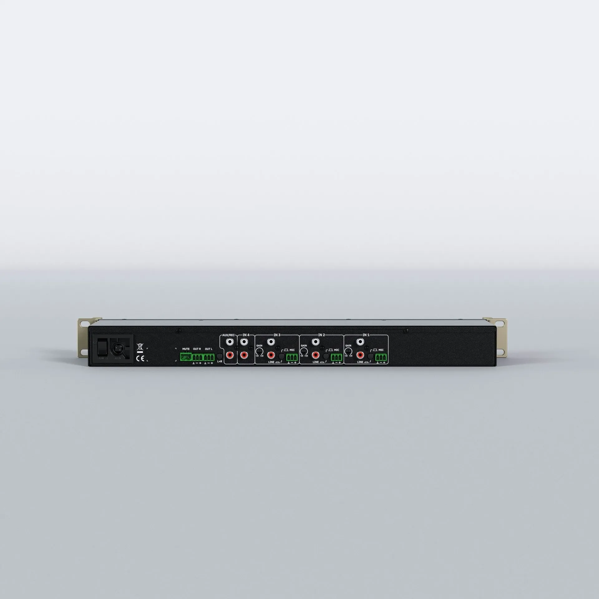 SAMI-402 is an installation audio mixer in standard rack format, featuring 3 MIC/LINE Stereo inputs, 1 LINE Stereo input, 1 main mix output and one AUX/REC additional output. It includes a 3 band tone control section, Talkover (priority) function assignable to each MIC/LINE input over the mix bus, ST/MONO mix switch and MUTE port for external dry contact triggering.