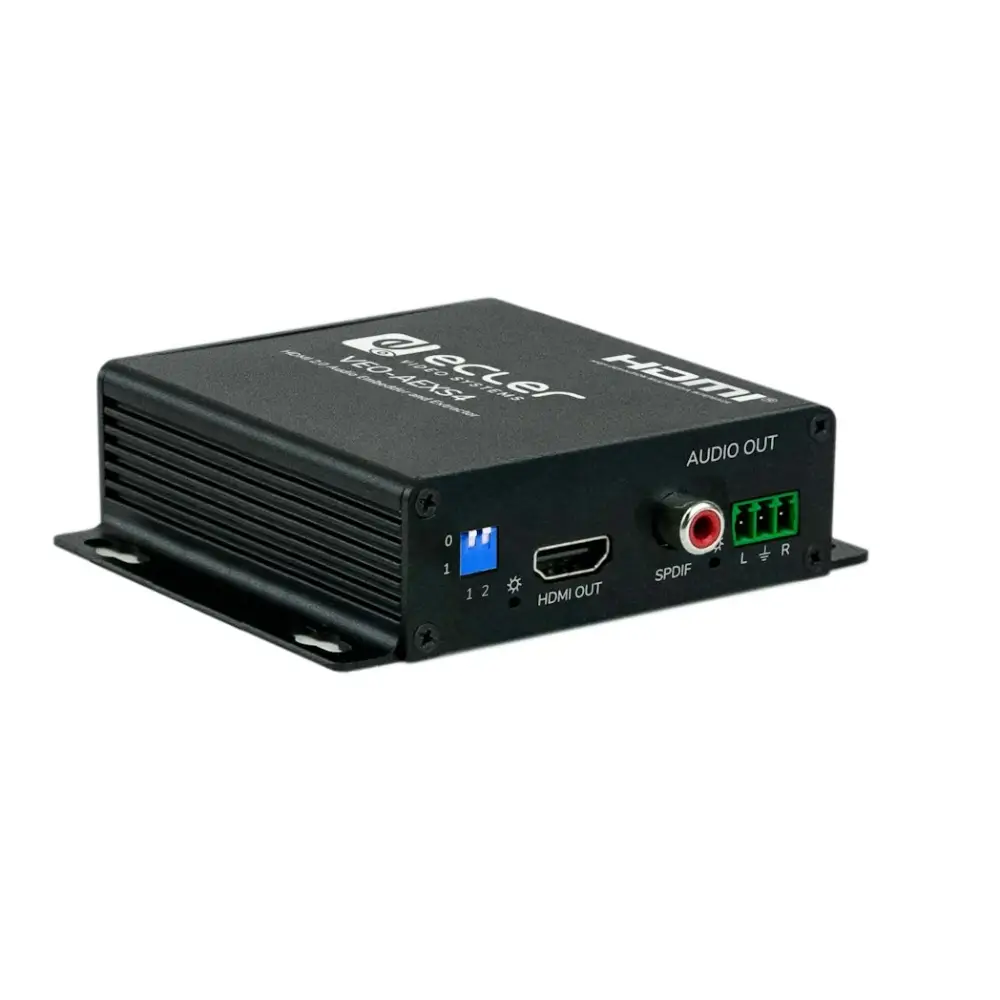 VEO-AEXS4 allows to extract and embed audio signals from the HDMI® input with support up to 4K video. It includes an unbalanced stereo analogue input and output with Euroblock connectors and a digital S/PDIF output with a coaxial connector. Function mode is selectable through the onboard dip-switch.