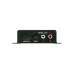 VEO-AXS4 allows to extract audio signals from HDMI® signals up to 4K. It provides a stereo analog output on RCA connectors or a 5.1 digital output on Toslink connector, selectable through the onboard switch.