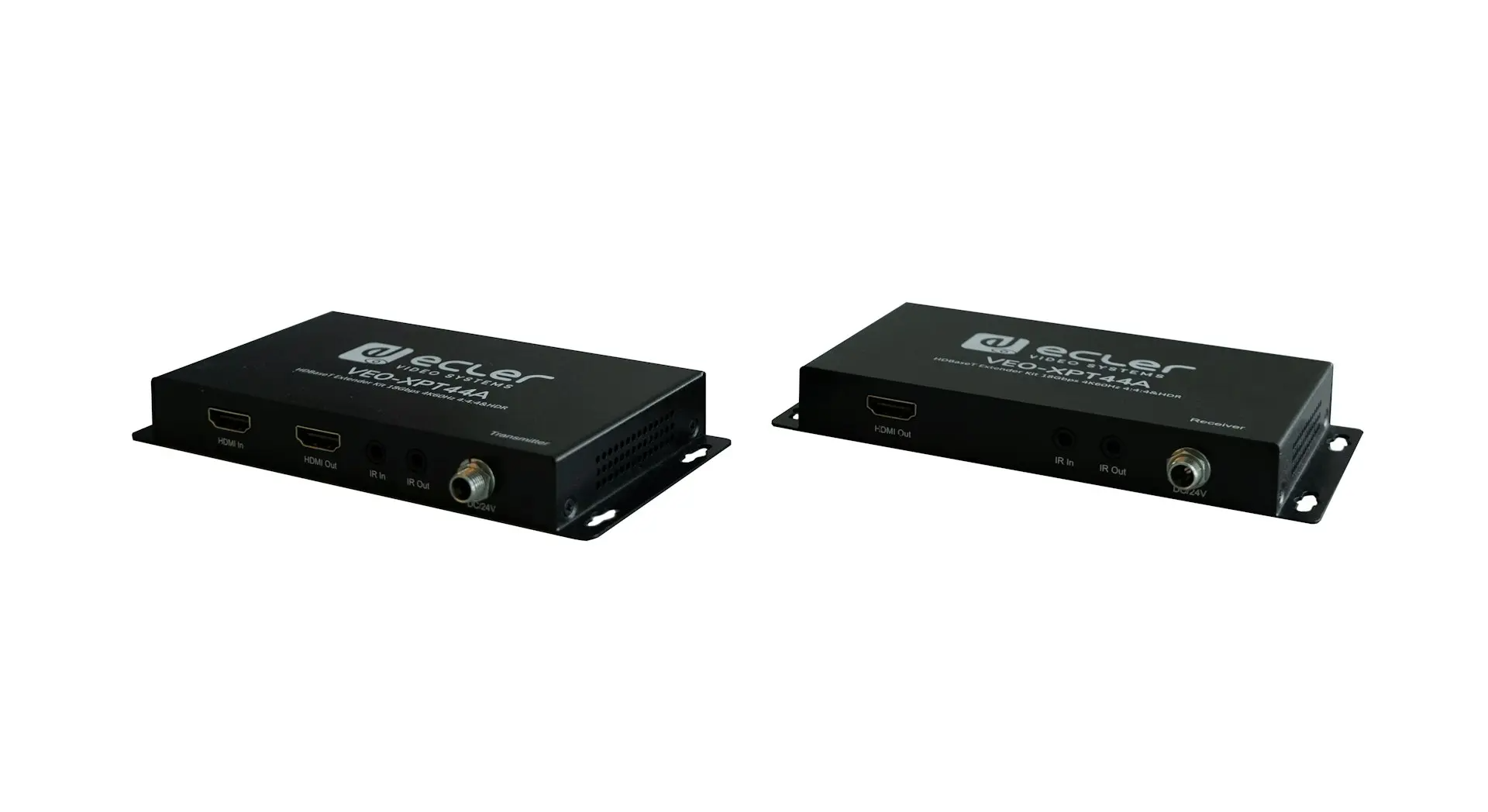 VEO-XPT44A is a professional HDBaseT extension kit that includes a transmitter and a receiver. It allows to extend a 4K video signal up to 40m or a Full HD signal up to 70m over a single Cat 5e/6 cable. It supports 4K video signals at 60Hz with 4:4:4 YUV chroma subsampling and HDR10. The transmitter includes a HDMI® loop output for monitoring or daisy-chain connection. A stereo unbalanced output on Euroblock connector is available both, on the transmitter and the receiver, for easy integration. In addition, VEO-XPT44A includes bidirectional PoH feature so the transmitter can be powered by the receiver and vice versa. With a reduced form factor and the added features of RS-232 and bidirectional IR, this is the perfect solution for any applications where AV and control extensions are required.