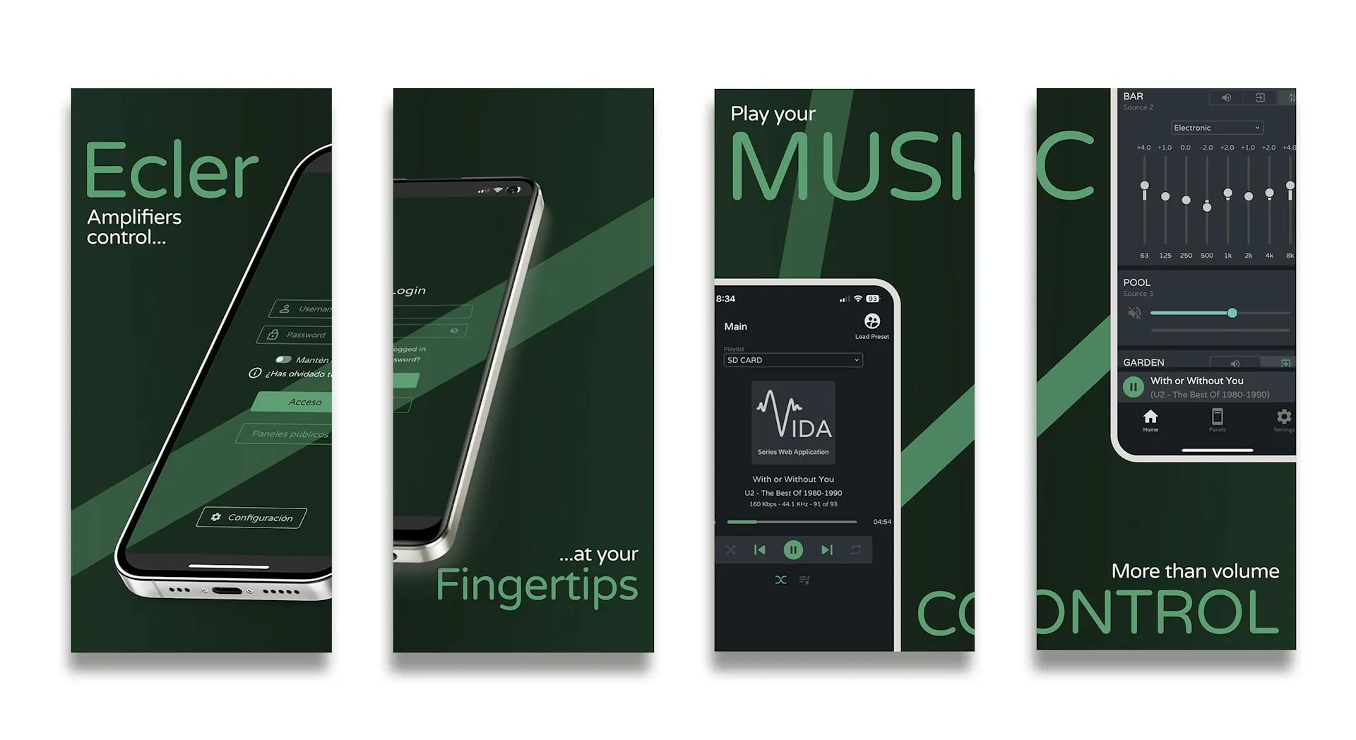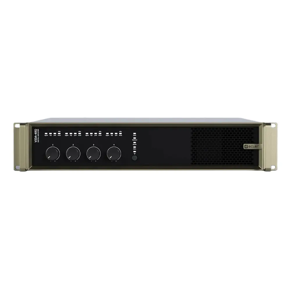 VIDA-48Q is a 4800W digital amplifier, with 4 amplified outputs that can be independently configured in high (100/70V) or low (8/4/2ohm) impedance. The VersaPower technology, developed by Ecler, allows an asymmetrical power distribution, and thanks to the Smart VersaPower tool it helps installers by facilitating a smart and fast configuration. In addition, the Class D amplification technology as well as the configurable 4-outputs auto standby and sleep mode functions, both configurable, further improve energy efficiency. This device offers a wide range of possibilities thanks to its 4 analogue and 4 Dante/AES67 digital inputs, audio player – with microSD slot for local audio files – as well as signal generator, plus 2 auxiliary line outputs and 4 Dante/AES67 digital outputs. All these features are managed from its intuitive web application which, among other functionalities, allows signal routing – matrix -, audio signal processing – such as equalisation or limiters -, priority management, GPIO configuration through events, as well as calendar events, playlist management and SD card content, thus facilitating the start-up of the audio-visual installation, its maintenance and customisation. Thanks to the Android/iOS/Web application available to the end user, the audio installation can be managed by them in an easy, intuitive, and customised way.