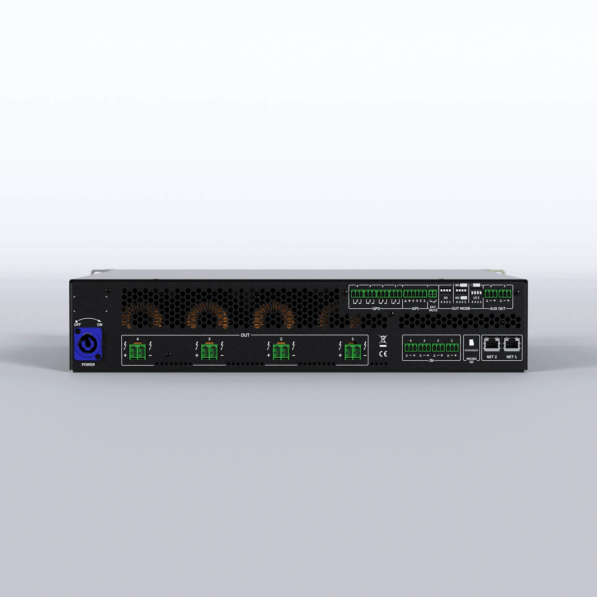 | Output configuration | Lo-Z/Hi-Z, 70V/100V, 4Ω/8Ω/2Ω Output mode selection per channel Rear panel DIP SWITCH selectors |