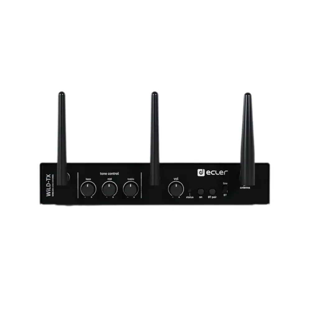 WiLD-TX is a transmitter device that communicates with all the receiver devices to create a WiLD wireless network. WiLD is the ultimate long-distance wireless audio solution. Designed for retail spaces, museums, and other markets, WiLD offers a cost-effective, robust, and user-friendly installation that blends seamlessly into any environment. Experience superior sound quality with minimal visual impact. Upgrade to WiLD today and transform your audio experience! The device features unbalanced (2XRCA) and Bluetooth® inputs with tone control. The main functions include pairing and sending audio content to all receiving devices (WiLD-14, WiLD-SB18), ensuring solid and stable communication. Additionally, it manages the global configuration of the system, including audio inputs in use, equalization, output levels, etc.